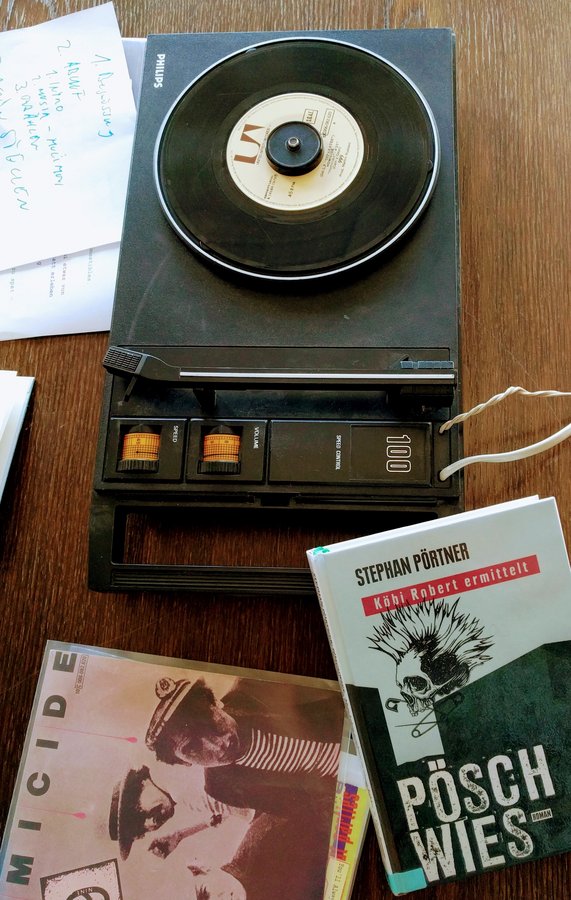 Die Eröffnung machte der Zürcher Krimiautor Stephan Pörtner. Sein erster Krimi «Köbi der Held» (1998) war einer der ersten Züri-Krimis überhaupt: Er erschien noch bevor es das Genre «Regio-Krimi» überhaupt gab. Normalerweise endet ein Krimi damit, dass der Täter im Gefängnis landet. Bei Pörtner beginnt der neuste Krimi «Pöschwies» mit der Entlassung seines Ermittlers Köbi aus dem Gefängnis. Und als ob er nicht genug Probleme mit Wohnungs- und Stellensuche hätte, schliddert Köbi in einen neuen Fall hinein. Dass Stephan Pörtner in den frühen 80er Jahren sein Leben dem Punkrock und der Politik widmete und ausserdem zehn Jahre lang erfolgreich ein Getränkeunternehmen führte, merkt man an den fachkundigen Passagen im Buch. Mit seinem tragbaren Retro-Schallplattenspieler vermittelt Stephan Pörtner den jugendlichen Zuhörerinnen und Zuhörern einen echten Eindruck von der Rock- und Punkszene seiner Jugend in den 80er Jahren, wo jede Party in der Küche einer WG an der Langstrasse endete. Alle Kapitel seines Buchs tragen als passende Überschrift den Titel und Namen einer Punk-Rock-Band. Diese Songs können als Spotify-Playlist «Köbi Musik» parallel zum Lesen angehört werden, was den Lesegenuss weiter steigert.