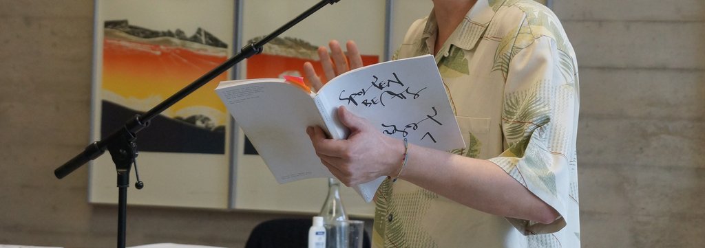 Mit der Performance einer seiner ersten Spoken-Beats über den Bahnhof Wädenswil und einer gekonnt performten Beatbox-Einlage gewinnt Jurczok 1001 sein jugendliches Publikum sofort für sich. Dass Erfolg nicht vom Himmel fällt, hat Jurczok 1001, der mit bürgerlichem Namen Roland Jurczok heisst, gleich zu Beginn erläutert. Doch Beharrlichkeit und Ideenreichtum zahlen sich aus: Dank einem Stipendium konnte er 2016 in New York leben. In dieser Zeit entstanden seine «Shirt-Stories», die kürzer sind als «short stories». Einen Tag lang notierte er alle T-Shirt-Aufschriften, die er in den Strassen New Yorks lesen konnte, und setzte diese getrennt nach männlichen und weiblichen Träger/innen zu seinen amüsanten und überraschenden «Shirt-Stories» zusammen. Die Sprache wird bei ihm zum Spiel, nicht nur auf der Bühne, sondern auch im Text. Für seine Performances benutzt Jurczok 1001 selbst nach all den Jahren noch immer Textblätter. Die Blätter tragen Spuren ihres Gebrauchs, lassen den Auftritt erkennen: Streichungen, Notizen, Vortragsweise, Tempobezeichnungen und Intonation sind mitzulesen und machen die Performance geradezu erlebbar. Damit auch die Schülerinnen und Schüler diese Vorgehensweise nachvollziehen können, teilt ihnen der Künstler den gedruckten Text mit seinen Kommentaren zum Mitlesen aus, bevor er das Stück «Gib mir…» performt. Der Autor begeistert die Lernenden: Diese gruppieren sich nach der Lesung zahlreich um ihn, um ihm weiterführende Fragen zu stellen.