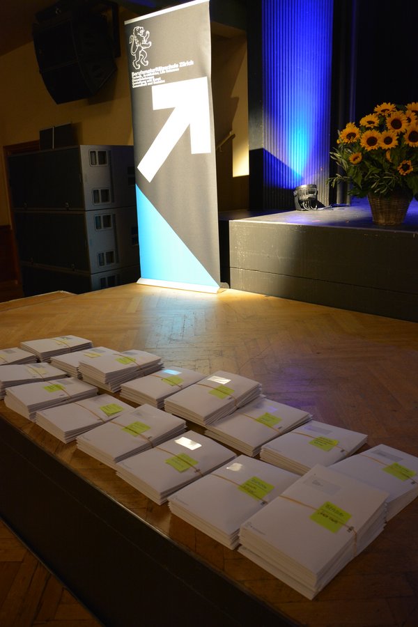 Nachdem abschliessend die Klassenlehrpersonen ihren Klassen vor der Bühne die Berufsmaturitätszeugnisse überreicht hatten, durften die Gäste beim Apéro auf den erfolgreichen Abschluss anstossen.