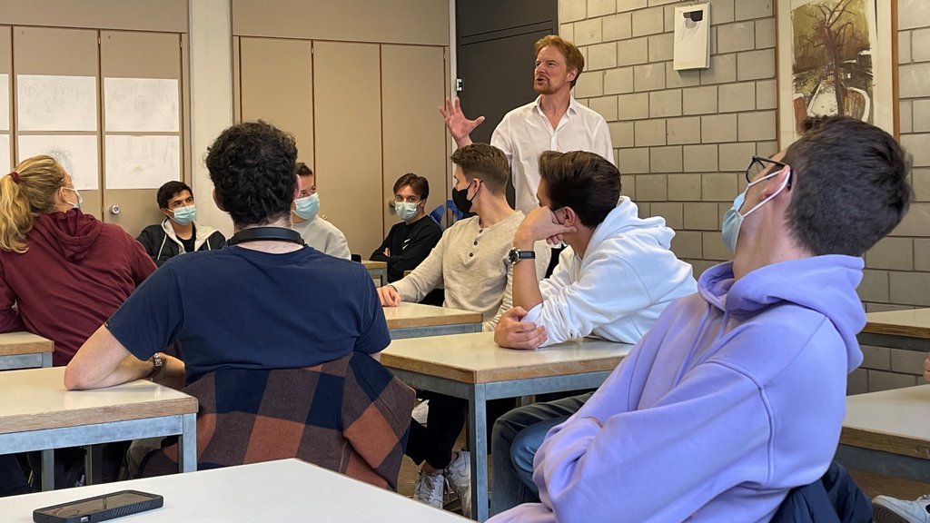 «Tod oder Freiheit?» – mit dieser Frage konfrontierte der deutsche Schauspieler und Theaterregisseur Daniel Kuschewski in seinem Schauspielsolo «SCHILLER!» acht Klassen und erntete erst einmal verwunderte Blicke, am Schluss jedoch tosenden Applaus. Kuschewski stand als junger Dichter Friedrich Schiller zwischen den Bankreihen und machte seinen Kampf zwischen gesellschaftlichen Zwängen und seinem Drang nach Freiheit erlebbar. Die emotionale Achterbahnfahrt kulminierte in Schillers Erkenntnis «Das Jahrhundert ist meinem Ideal nicht reif.» Schiller wollte mit seinen Theateraufführungen die Gesellschaft verändern. Ob und wie dies gelingen kann, welchen Stellenwert das Theater in der heutigen Zeit geniesst oder wie ein Theaterstück überhaupt entsteht, diese Fragen konnten die Lernenden im Anschluss an das Stück mit dem Schauspieler Daniel Kuschewski und der Theaterpädagogin Petra Fischer diskutieren.